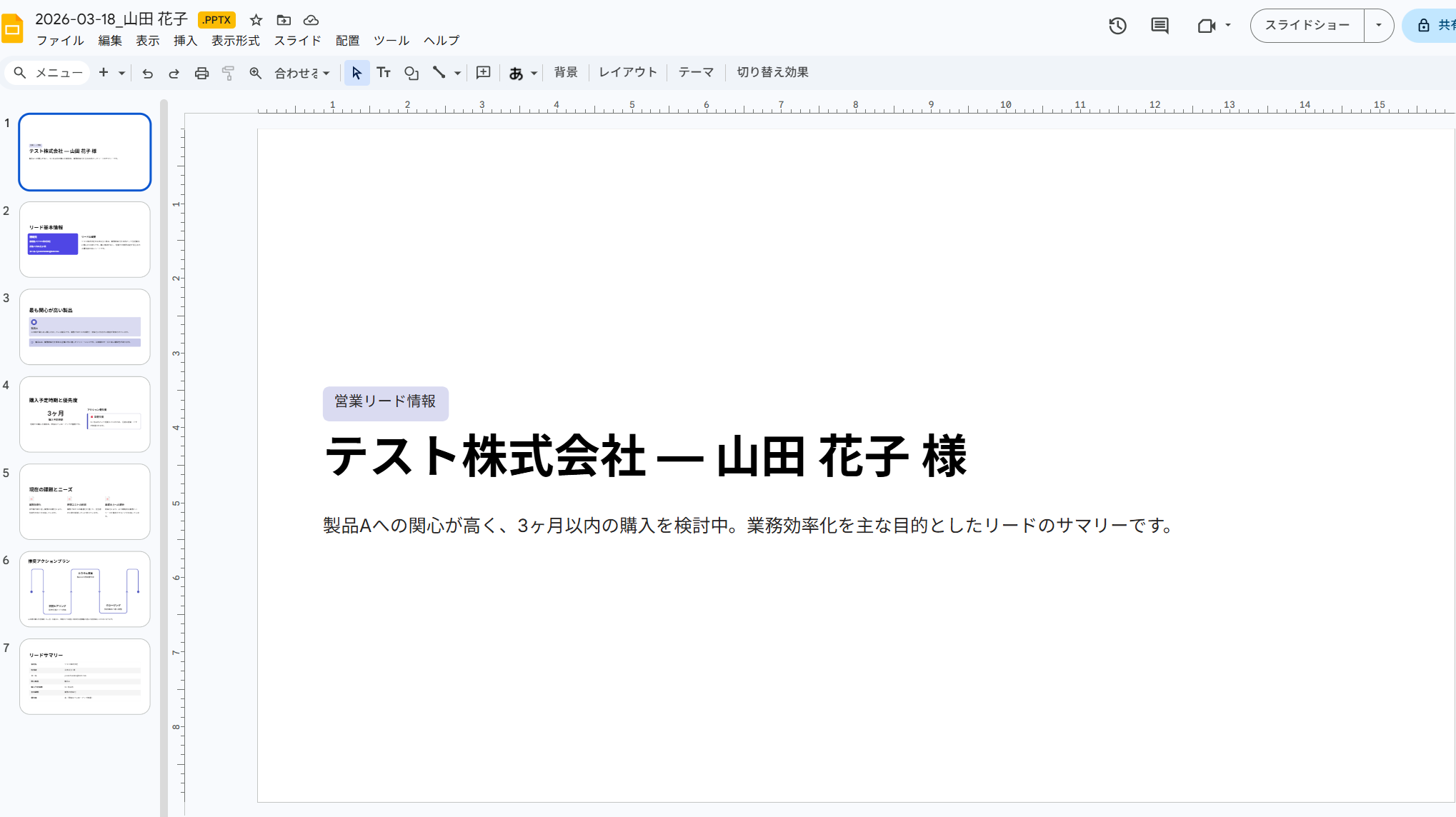 Gammaでスライドを生成する際に、Salesforceから連携するリード情報(会社名、氏名など)は任意で設定可能です。 Gammaで生成したスライドのファイル名は、「【株式会社〇〇様】会社紹介資料」のように、任意の内容に変換できます。 Gmailの「メールを送る」オペレーションでは、送信先のメールアドレス、件名、本文を自由に設定することが可能です。 ■注意事項