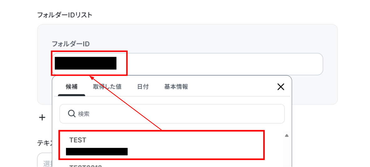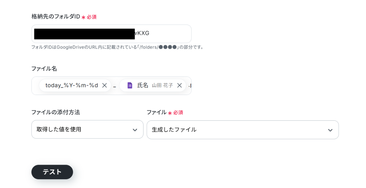 「フォルダーIDのリスト」は候補から選択できます。 その他の項目は必須項目ではありません。必要な項目に入力を行ってください。 入力が終わったら「テスト」をクリックしましょう!