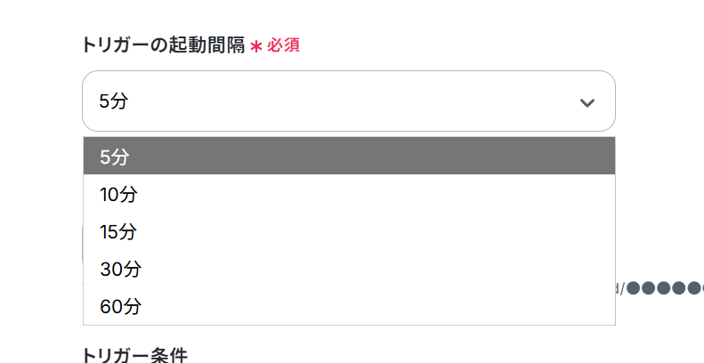 「API接続設定」画面から、トリガーの起動間隔を選択します。 トリガーの起動間隔はプルダウンより5分、10分、15分、30分、60分の間隔から選択してください。