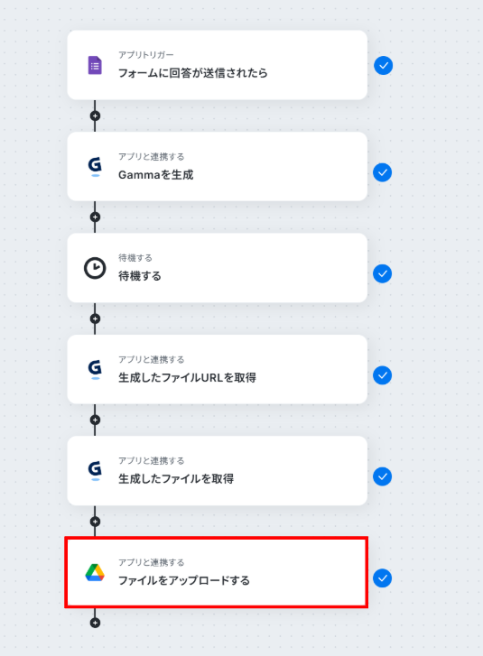 テストに成功すると、指定したGoogle DriveにGammaで生成されたファイルがアップロードされます!