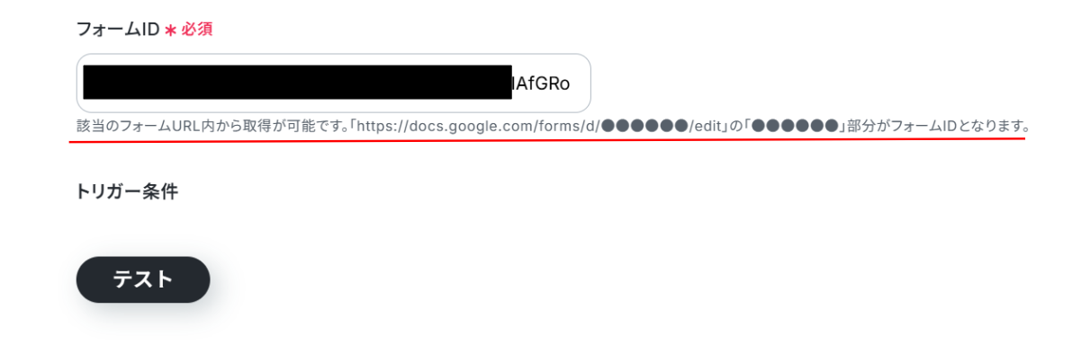 「フォームID」は赤線を確認の上、先ほど作成したテスト用フォームのフォームIDを入力します。 入力が終わったら「テスト」をクリックしましょう!