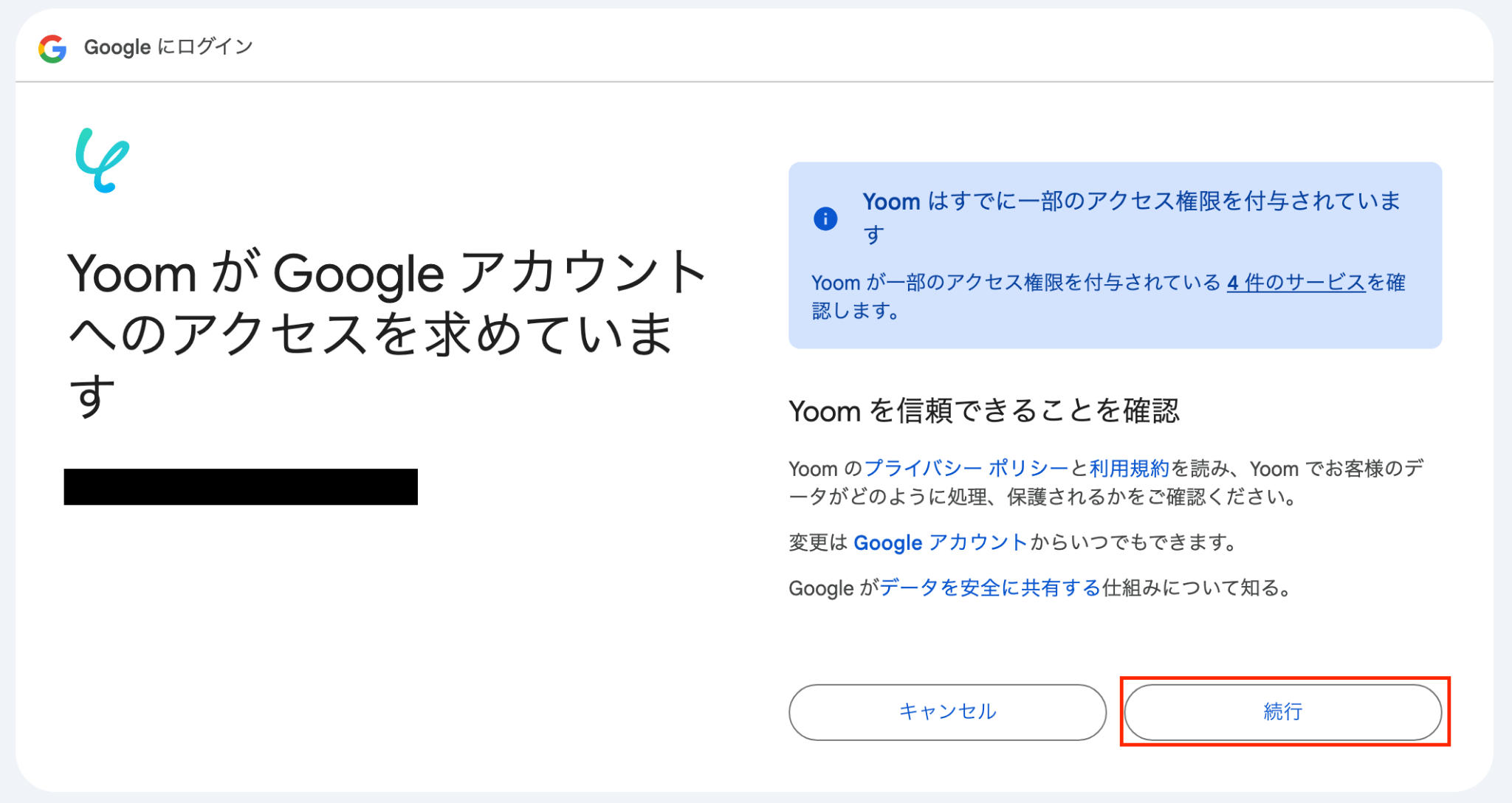 最後に「続行」をクリックして、Google Meetのマイアプリ連携が完了です!