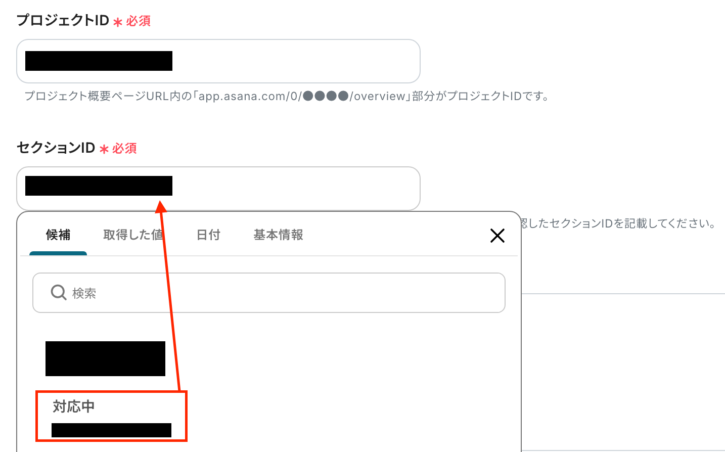 Google Meetでの会議終了をトリガーとして、Asana上の既存タスクを特定のセクション(例:「未着手」から「対応中」へ)に自動で移動させます。
