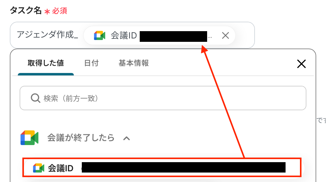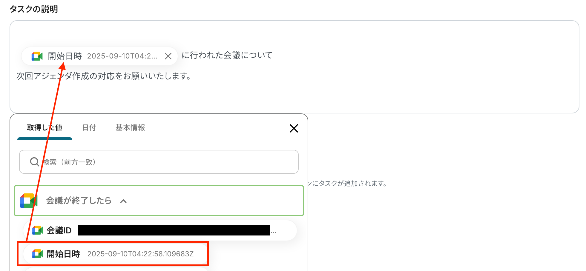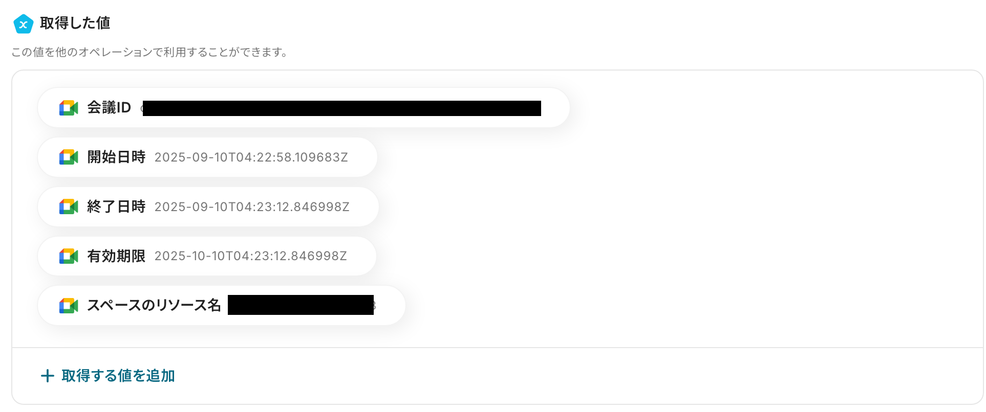 テストに成功すると、Google Meetから取得した内容が取得した値に表示されます。