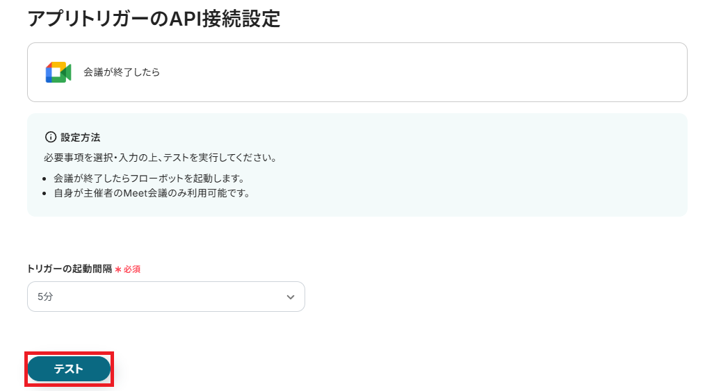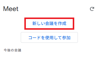 この後のテスト操作で、実際にGoogle Meetで会議を終了している必要があるため、一度Google Meetで会議を立ち上げ終了してください。