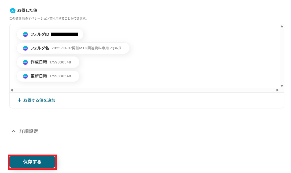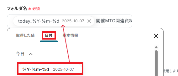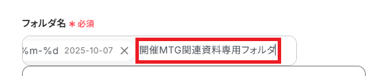 また固定値を組み合わせる事も可能ですので、用途に合わせて自由に入力してみてください。今回は「日付(アウトプット)+開催MTG関連資料専用フォルダ(固定値)」 になるよう設定しました。