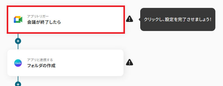 今回はGoogle Meetで会議が終了したら、Canvaにフォルダを作成するフロー を作成していきます! 作成の流れは大きく分けて以下です。