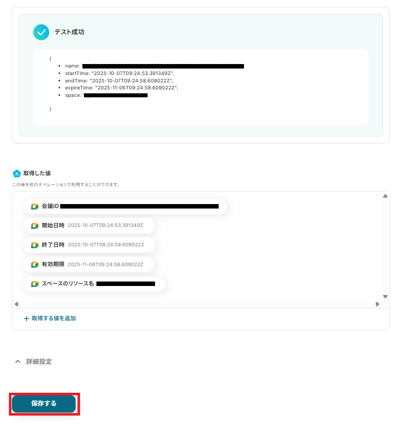 テストが成功すると、下記のような取得した値が表示されます。取得した値はこのあとの設定でも使用します。 ※取得した値とは?