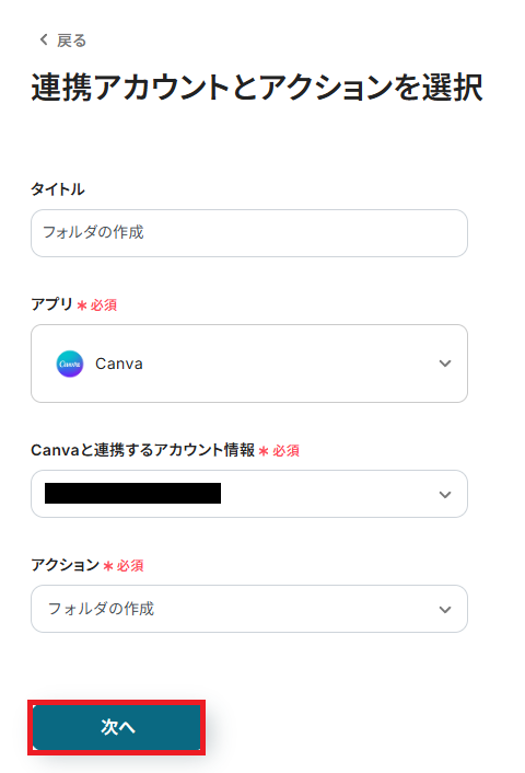 クリックすると以下の画面に切り替わります。 Canvaと連携するアカウントに間違いがないかを確認し、「次へ」をクリックしましょう。