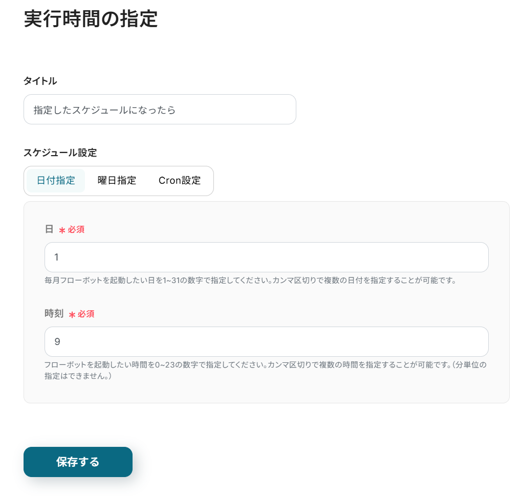 今回は、毎月1日の9時にフローボットが起動するように設定しました。