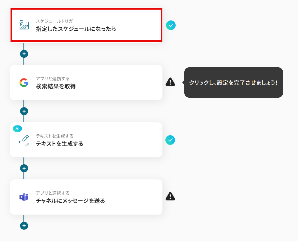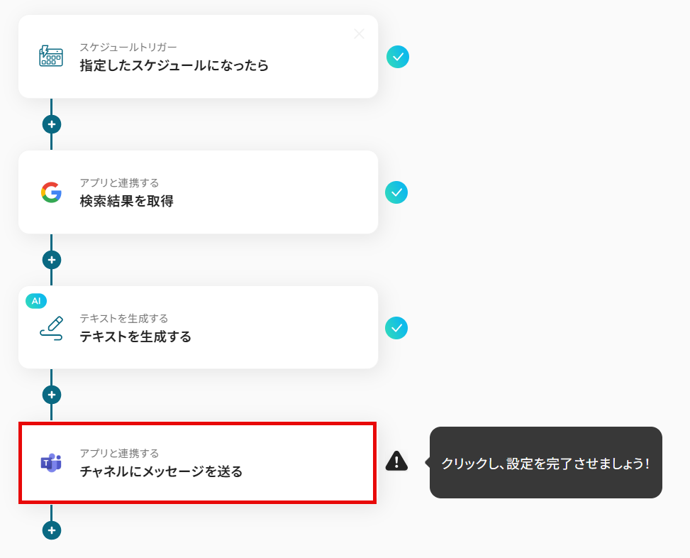 このワークフローを活用すれば、指定したスケジュールでGoogle 検索を自動実行し、AIが要約した分析結果をMicrosoft Teamsに通知できるためこうした定型業務を効率化できます。