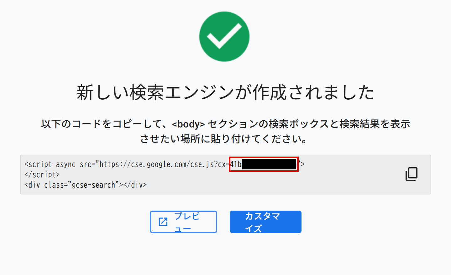検索エンジンを作成すると、赤枠部分に記載されている英数字が検索エンジンIDになります。