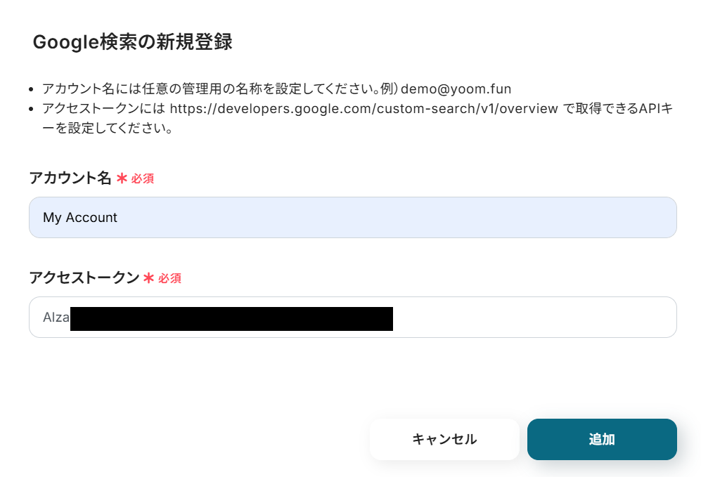 Yoomの画面にAPIキーを貼り付けて「追加」をクリックしたらアプリ連携は完了です!