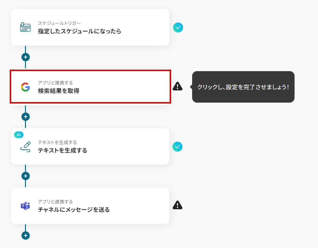 この連携を利用すれば、設定したスケジュールで自動的にGoogle 検索を実行し、その結果をMicrosoft Teamsの指定チャンネルに通知するため、市場調査や競合分析といった定型業務を完全に自動化し、戦略立案などのコア業務に集中できる時間を確保できます。