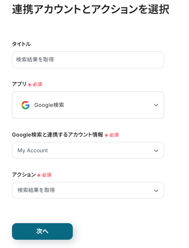 前項で設定したスケジュールになったら、Google 検索の検索結果を取得する設定を行います。