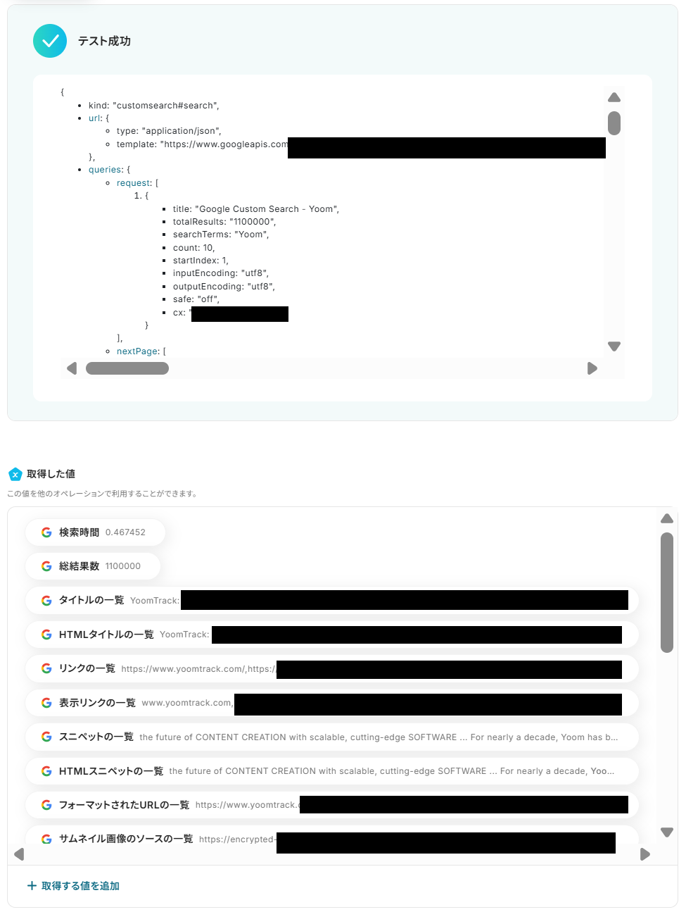 今回の検索クエリは「Yoom」と設定していますが、実際に取得したいキーワードを設定しましょう。