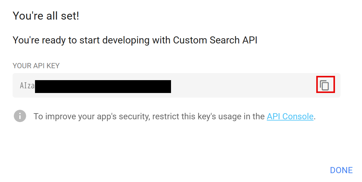 以下のようにAPIキーが表示されるので、コピーをし、Yoomの画面に戻ります。