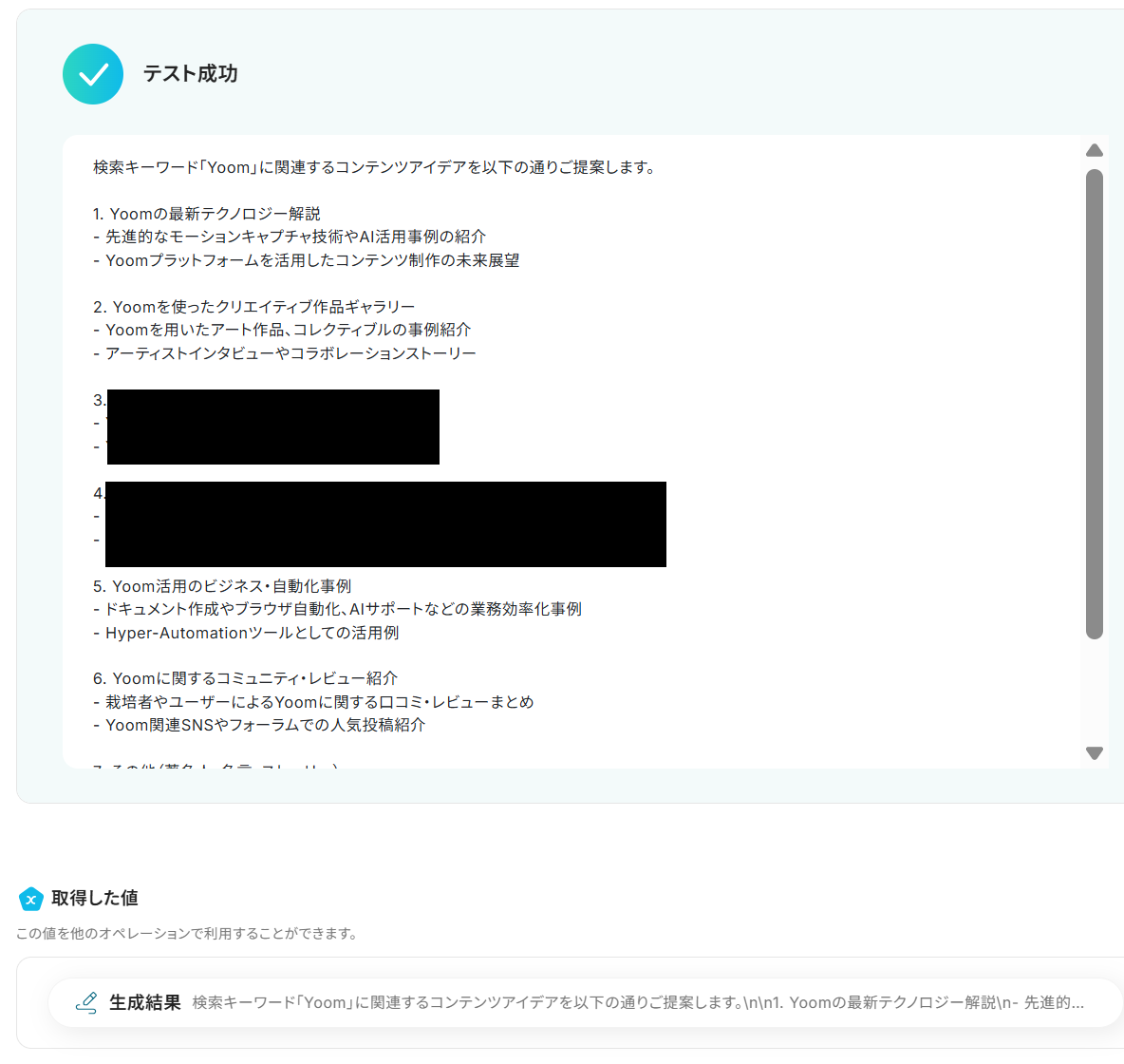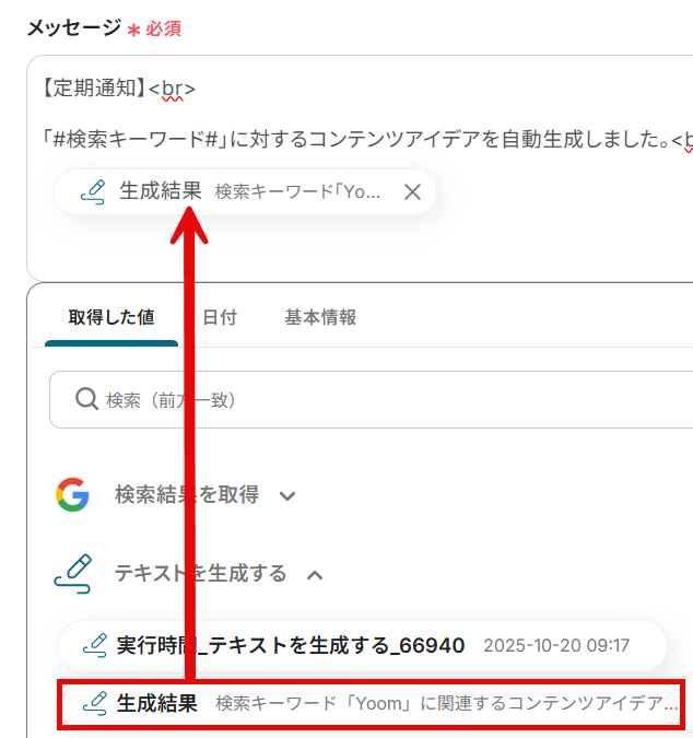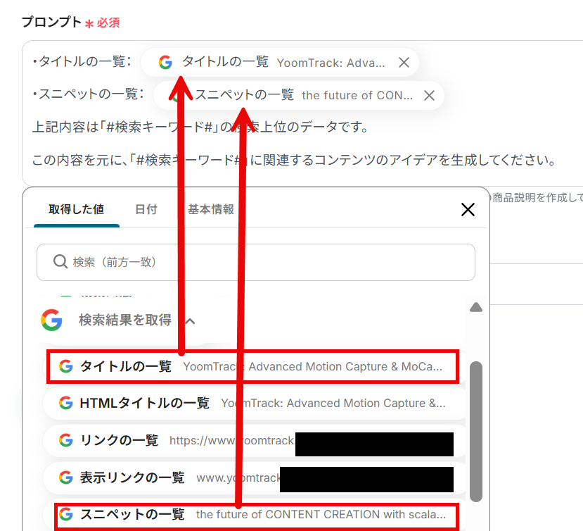 プロンプトには、前項で取得した値から「タイトルの一覧」と「スニペットの一覧」を選択し、この内容をもとに検索キーワードに関連するコンテンツのアイデアを生成するように指示しました。