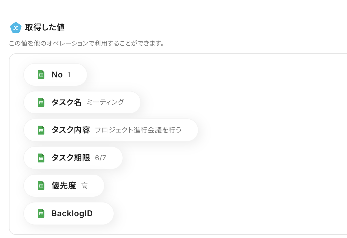 このテンプレートを活用すれば、Backlogで新しい課題が追加されたら、その情報を自動的にGoogle スプレッドシートの指定したシートに行として追加することができます。