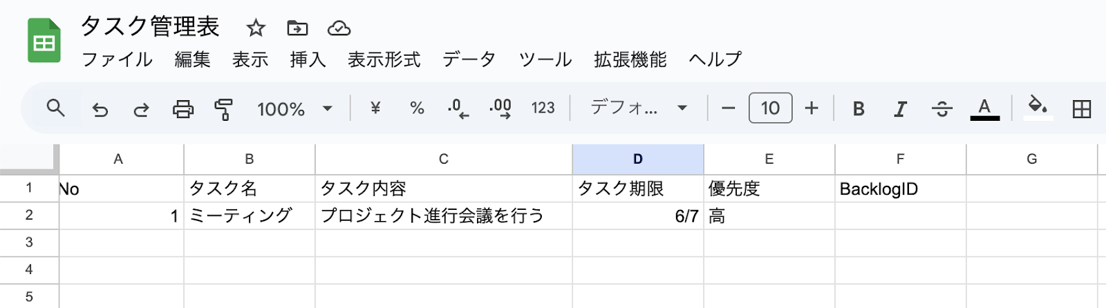 今回は以下のGoogle スプレッドシートを用意しました。 このGoogle スプレッドシートのタスク情報をBacklogの課題に追加していきます。