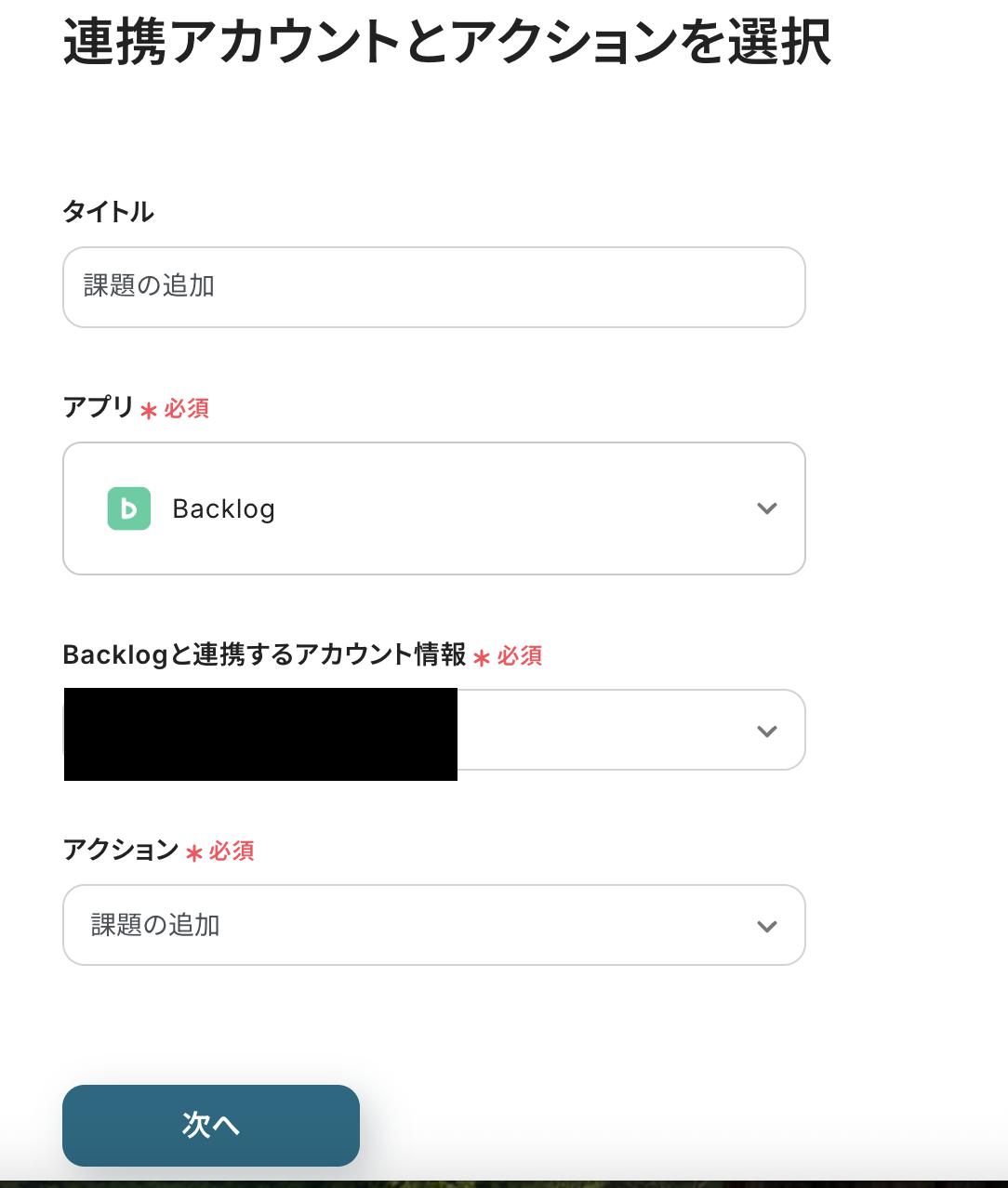 こちらの画面はすでに設定ができています。 タイトルを変更する場合は入力し、Backlogと連携するアカウントとアクション(課題の追加)を確認し、次へをクリックしてください。