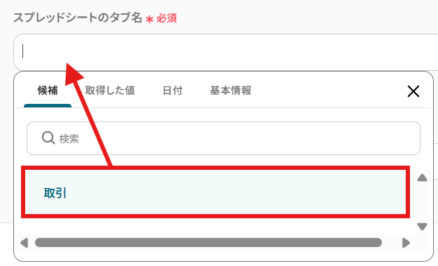 スプレッドシートのタブ名:プルダウンより対象のシートを選択しましょう。