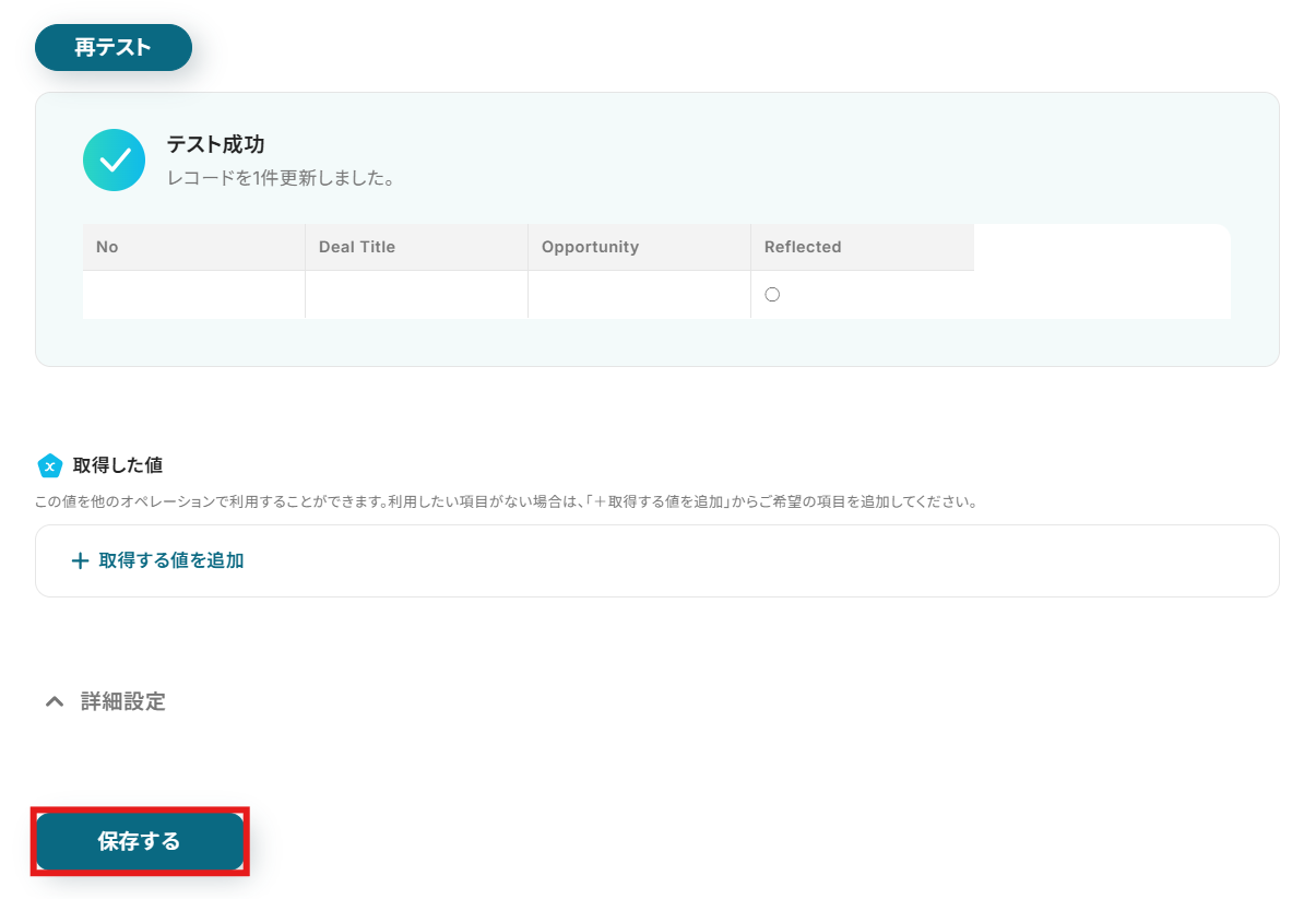 テスト成功が表示されていれば設定完了となります。 画面下の保存するボタンをクリックし、Google スプレッドシートの更新設定を完了させてください。