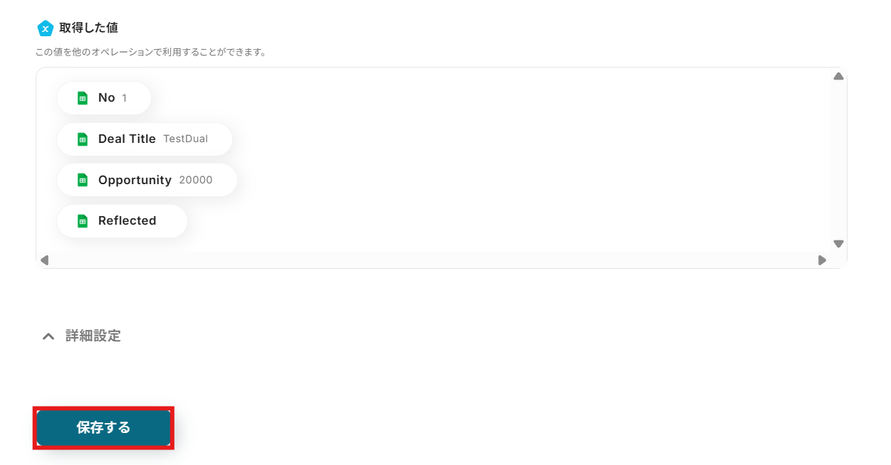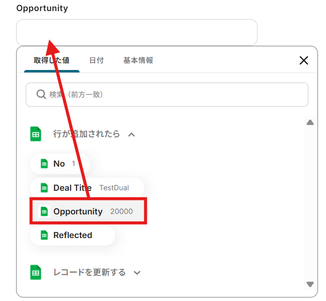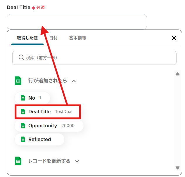 Deal Title:プルダウンに表示される取得した値よりDeal Titleを選択してください。 取得した値を活用することで、トリガーが実行されるたびに最新情報の反映ができます。