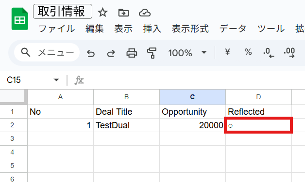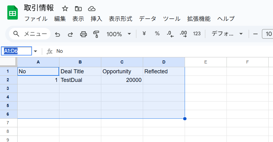 また、このタイミングでGoogle スプレッドシートにDeal作成の元となるレコードを追加してください。(ヘッダーも必要です。) 今回は以下のようなレコードを作成しています。