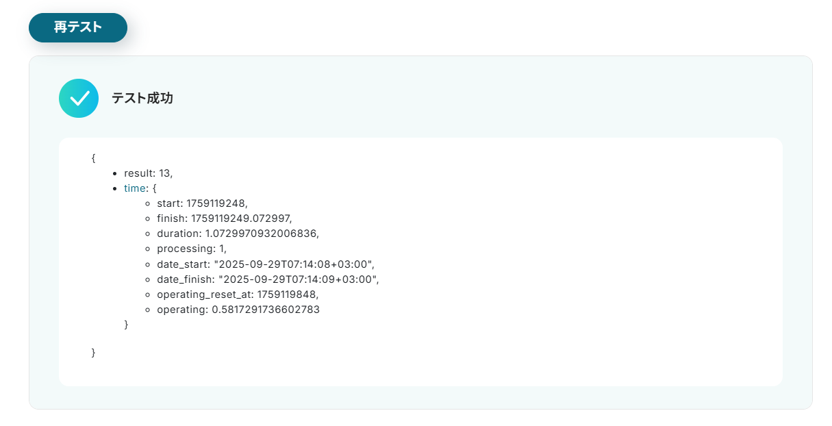 設定が完了したらテストボタンをクリックしましょう。(※実際にGoogle スプレッドシートに更新が行われます。)