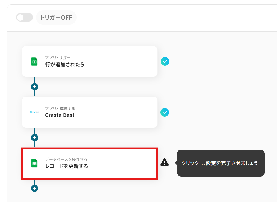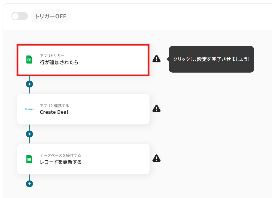 Google スプレッドシートで管理している案件リストに新しい行が追加された際に、その情報を自動で取得し、Bitrix24に新しいDeal(取引)として登録する 連携です。