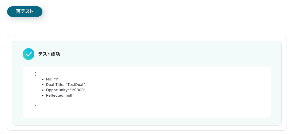 この仕組みにより、手動でのデータエクスポートや転記作業が不要になり、常に最新の案件リストをGoogle スプレッドシート上で確認 できるようになります。