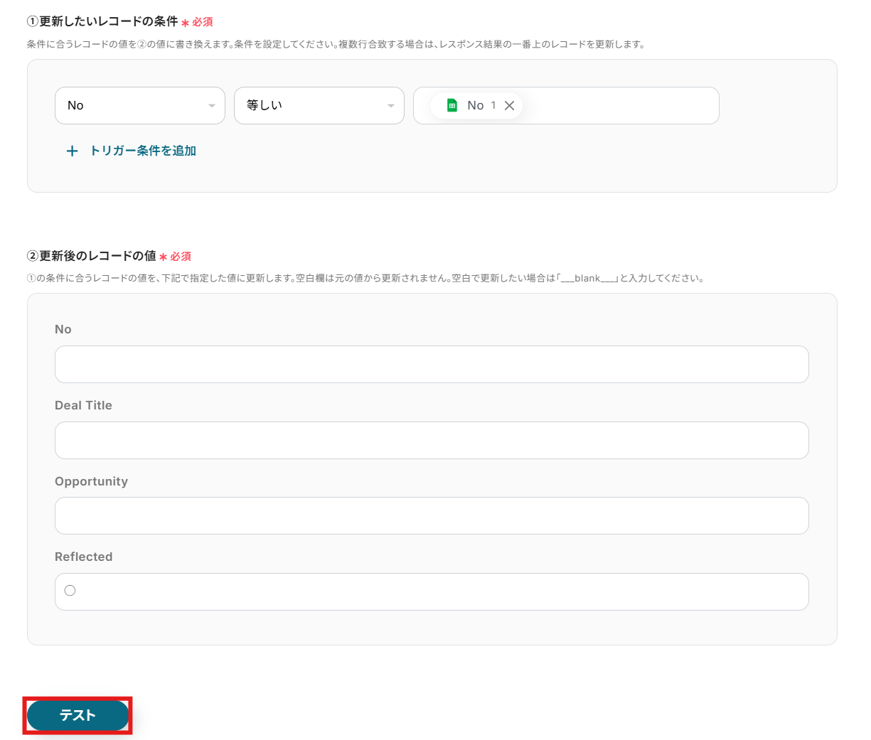 1.更新したいレコードの条件:更新対象のレコードを絞り込む条件を設定しましょう。