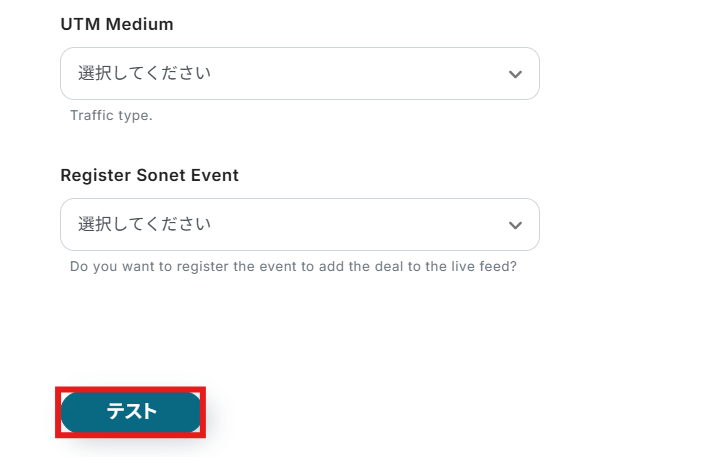 その他の項目は任意で設定を行ってください。 設定が完了したらテストボタンをクリックしましょう。(※実際にBitrix24にDealが作成されます。)