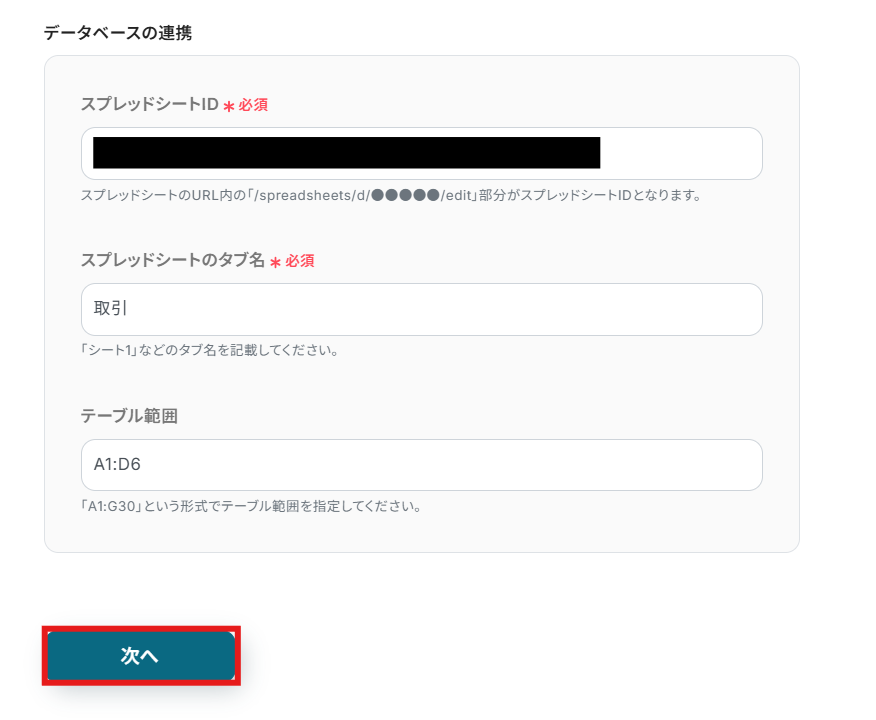 テーブル範囲などの項目は作成したGoogle スプレッドシートをもとに入力してください。 一意の値が入った列は必ず、値の重複しない列 を選択してください。