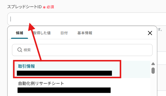 スプレッドシートID:プルダウンより対象のGoogle スプレッドシートを選択しましょう。