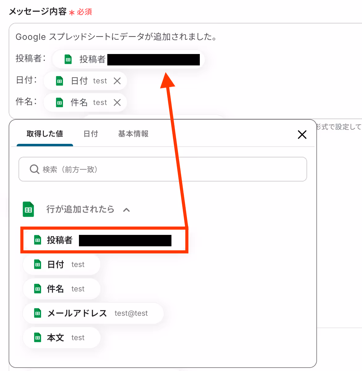 アウトプットとは、トリガーやオペレーション設定時に、「テスト」を実行して取得した値のことを指します。