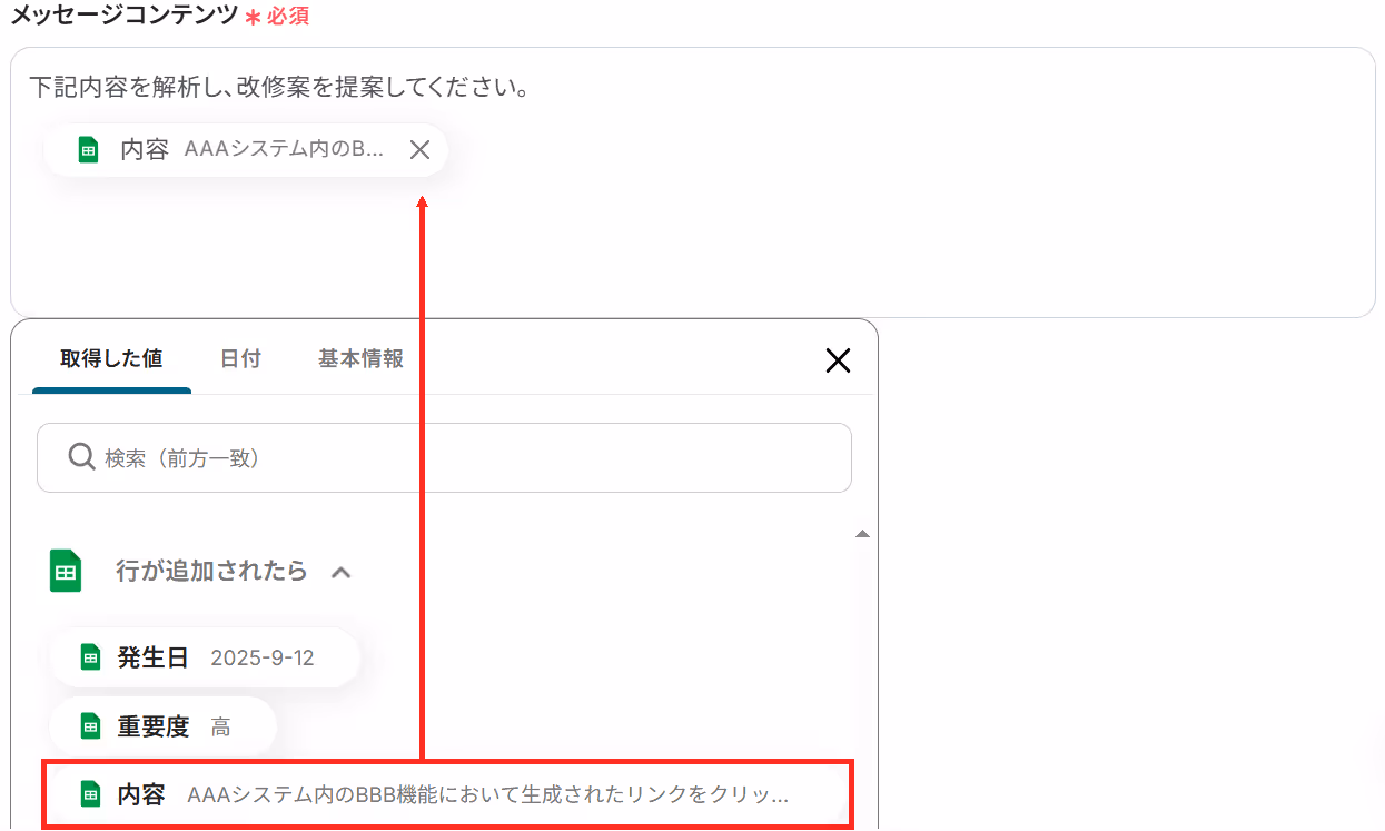 ※以下のようにGoogle スプレッドシートの該当列(今回でいうとC列の「内容」)のアウトプットを設定することで、トリガーが実行されるたびに最新の情報を反映できます。