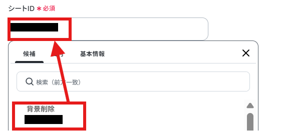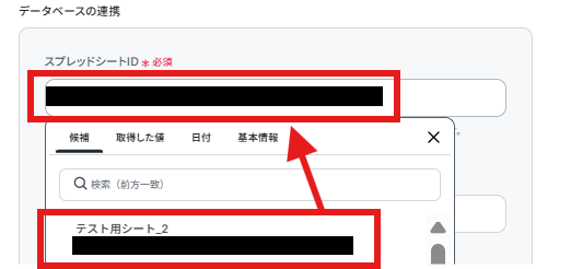 上記シートを「データベースの連携」部分で指定していきます。「スプレッドシートID」、「シートID」を候補より選択しましょう。
