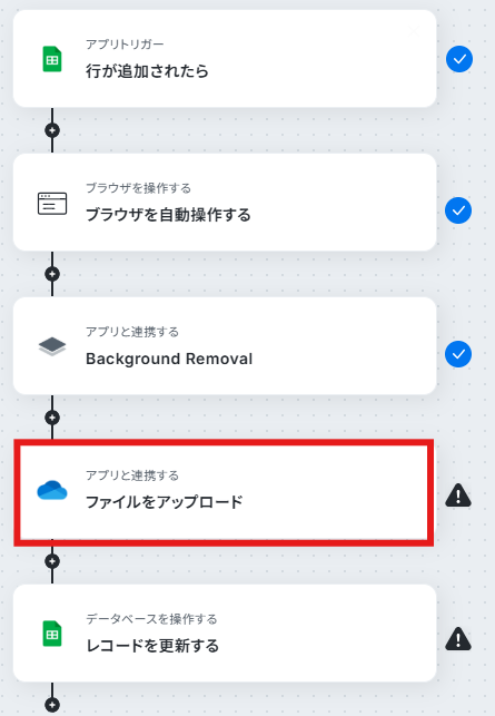 Google スプレッドシートのトリガー設定およびレコード更新のオペレーションでは、対象のスプレッドシートやシートを任意で設定することが可能です。 OneDriveにファイルをアップロードするアクションでは、保存先のフォルダやファイル名を任意で設定できます。 ■注意事項