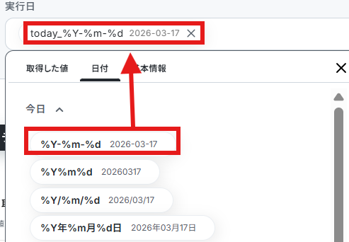 保存する際のファイル名を記載します。日付や取得した値も使えますのでわかりやすく入力しましょう。 今回はデフォルトの値を参考に以下のように入力しています。