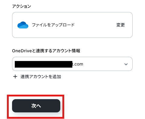 アクションはデフォルト設定のまま、アカウント情報は、連携したいアカウントが選択されているか確認してください。確認出来たら「次へ」をクリックしましょう。