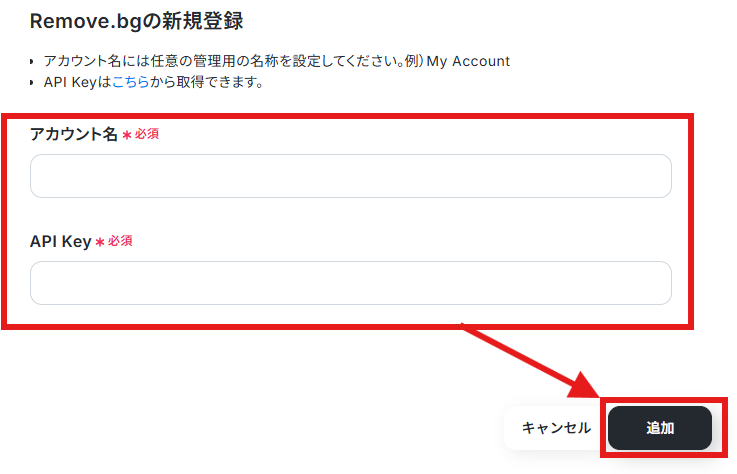 任意のアカウント名を入力し、画面注釈に沿ってAPI Keyを取得、入力して「追加」をクリックしてください。 マイアプリのページに「Remove.bg」が表示されれば完了です。