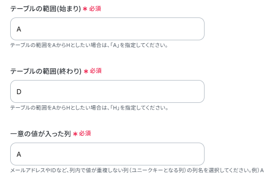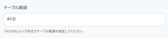 テーブル範囲は今回以下のように設定しました。一意の値が入った列は、毎回違う値のURLが入る「A」としています。