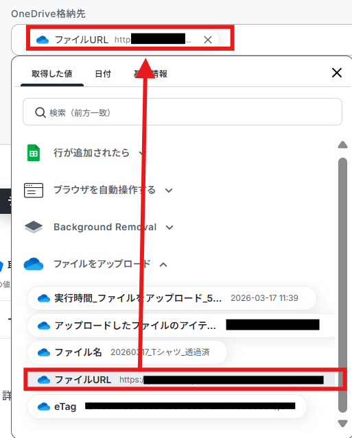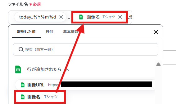 【Tips】 取得した値は、フローボットを起動する度に変動する値となります。 これにより、毎回変動する情報を手動で入力する必要がなくなり、効率的に連携できます! なお、テキスト部分は固定値として扱われるため、下記画像のように入力すると、毎回「日付_画像名_透過」の規則に従ってファイル名が作成されます。