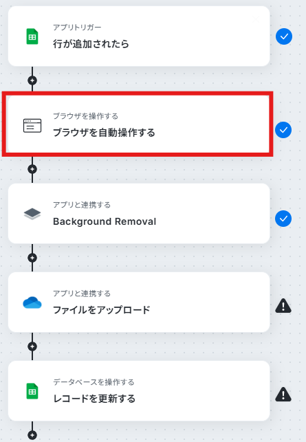 はじめに、Google スプレッドシート、Remove.bg、OneDriveをYoomと連携します。 次に、トリガーでGoogle スプレッドシートを選択し、「行が追加されたら」というアクションを設定します。 次に、オペレーションでRPA機能を使い「ブラウザを自動操作する」アクションを設定し、Google スプレッドシートのURLから画像をダウンロードします。 次に、オペレーションでRemove.bgの「Background Removal」アクションを設定し、ダウンロードした画像の背景を削除します。 次に、オペレーションでOneDriveの「ファイルをアップロード」アクションを設定し、背景を削除した画像を保存します。 最後に、オペレーションでGoogle スプレッドシートの「レコードを更新する」アクションを設定し、処理が完了した行に保存先のURLなどを記録します。 ※「トリガー」:フロー起動のきっかけとなるアクション、「オペレーション」:トリガー起動後、フロー内で処理を行うアクション■このワークフローのカスタムポイント