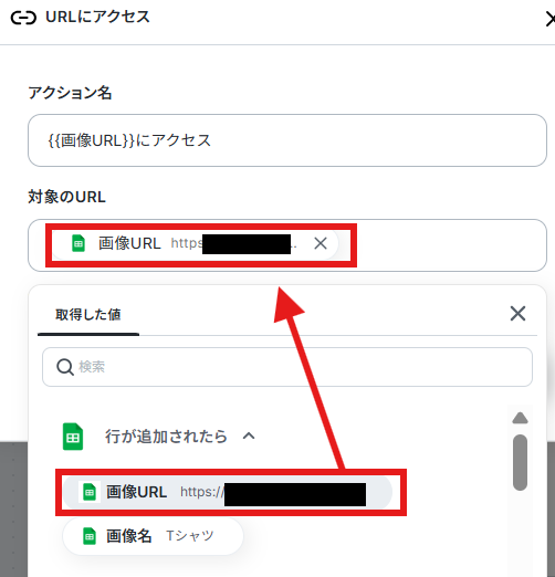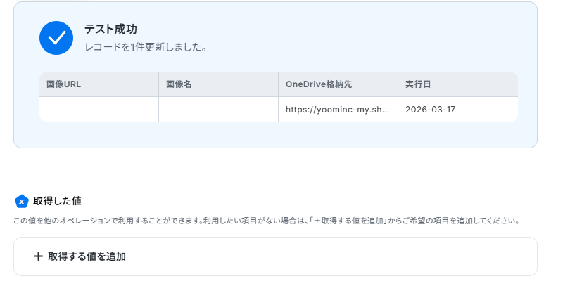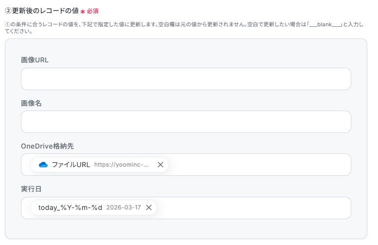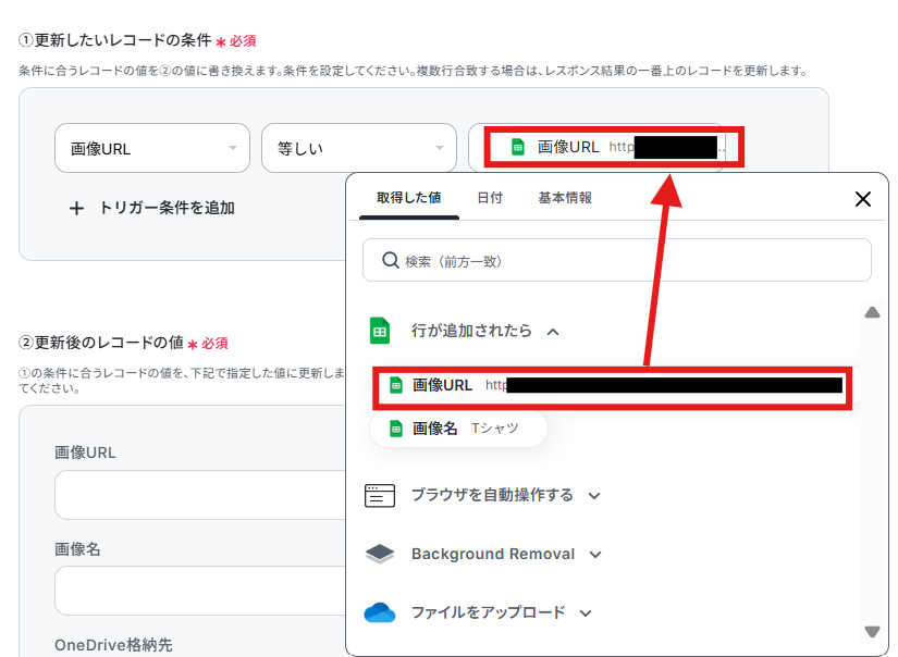 更新したいレコードの条件は、今回処理した画像の行を更新したいので取得した値から下記のように画像URLを入力してください。