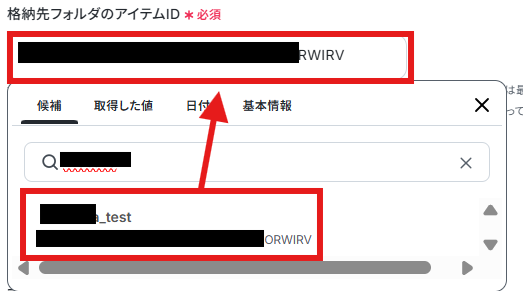 「ドライブID」「格納先フォルダのアイテムID」を候補から選択してください。