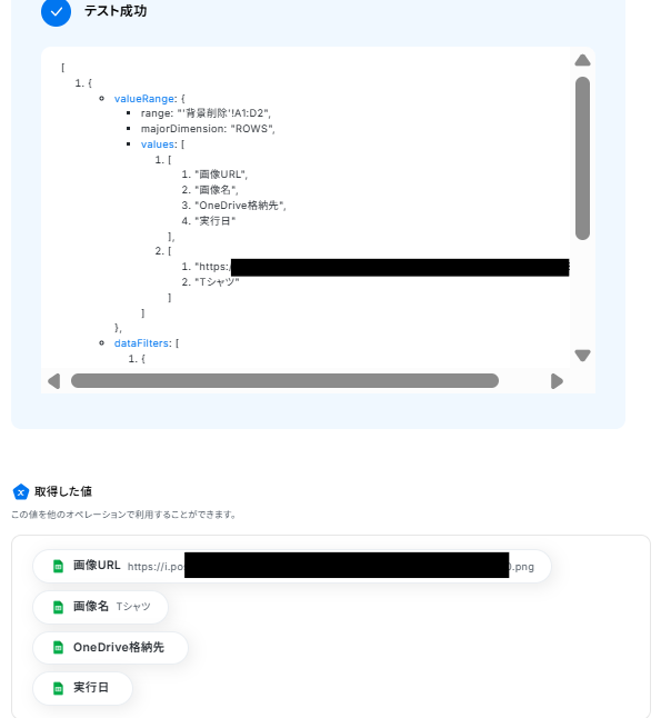ここまで終わったらテストボタンをクリックしましょう。テストが成功し、取得した値が入ります。