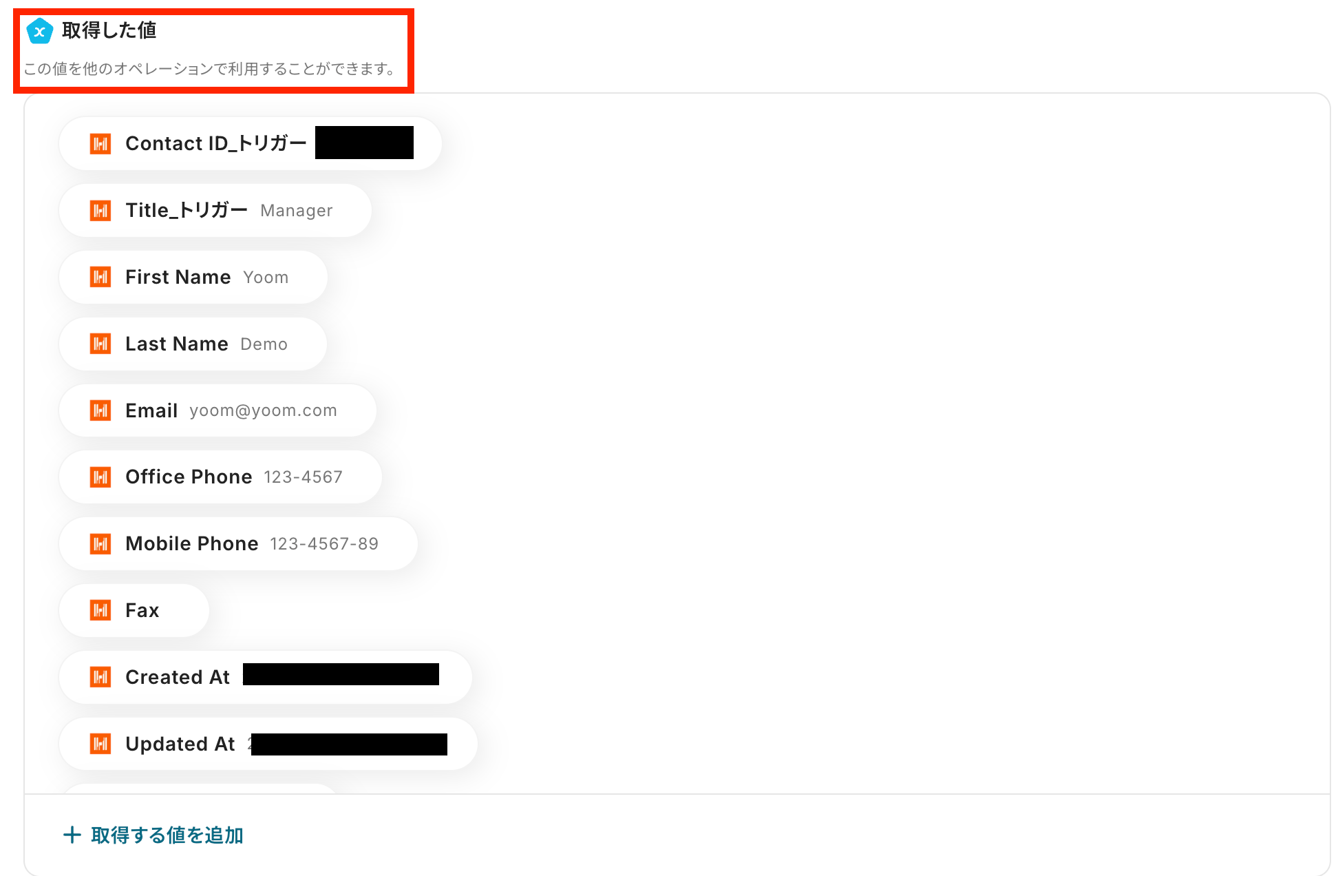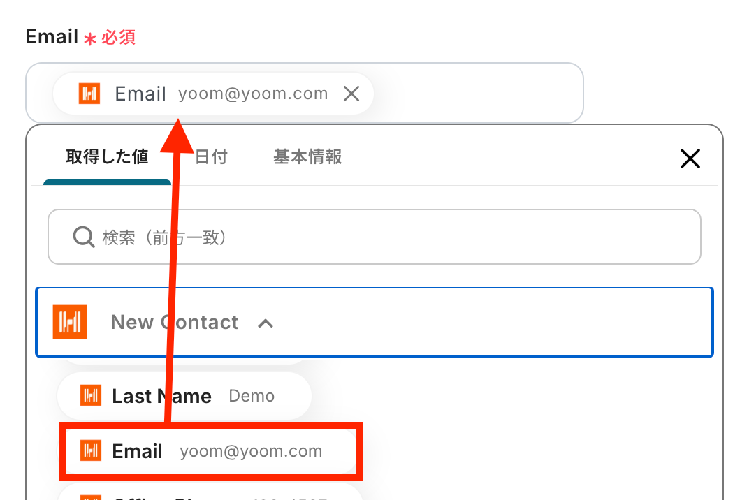 Harvestから取得した値を利用して、Loopsにコンタクトを作成する設定を行います。 2つ目の赤枠をクリックしてください!